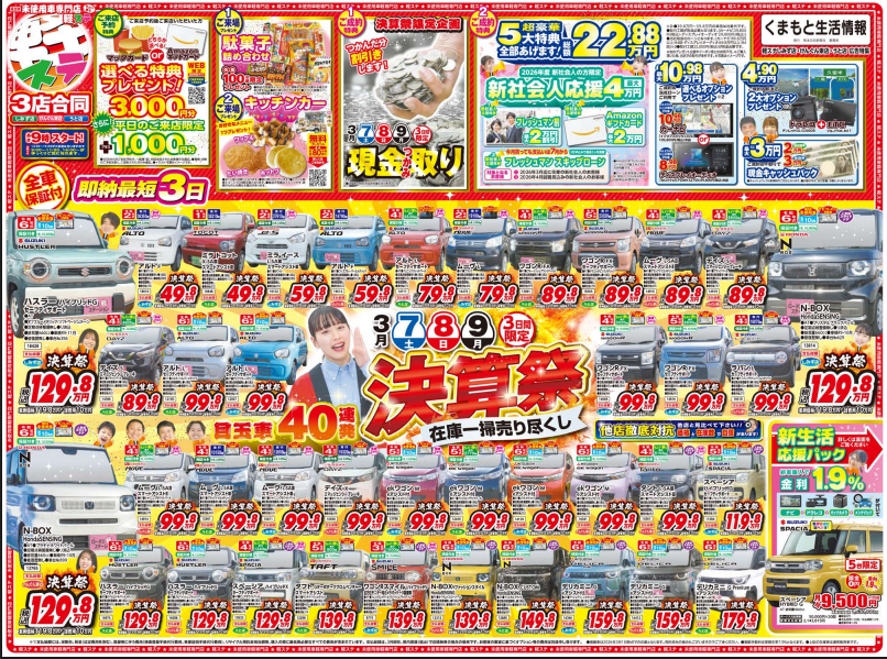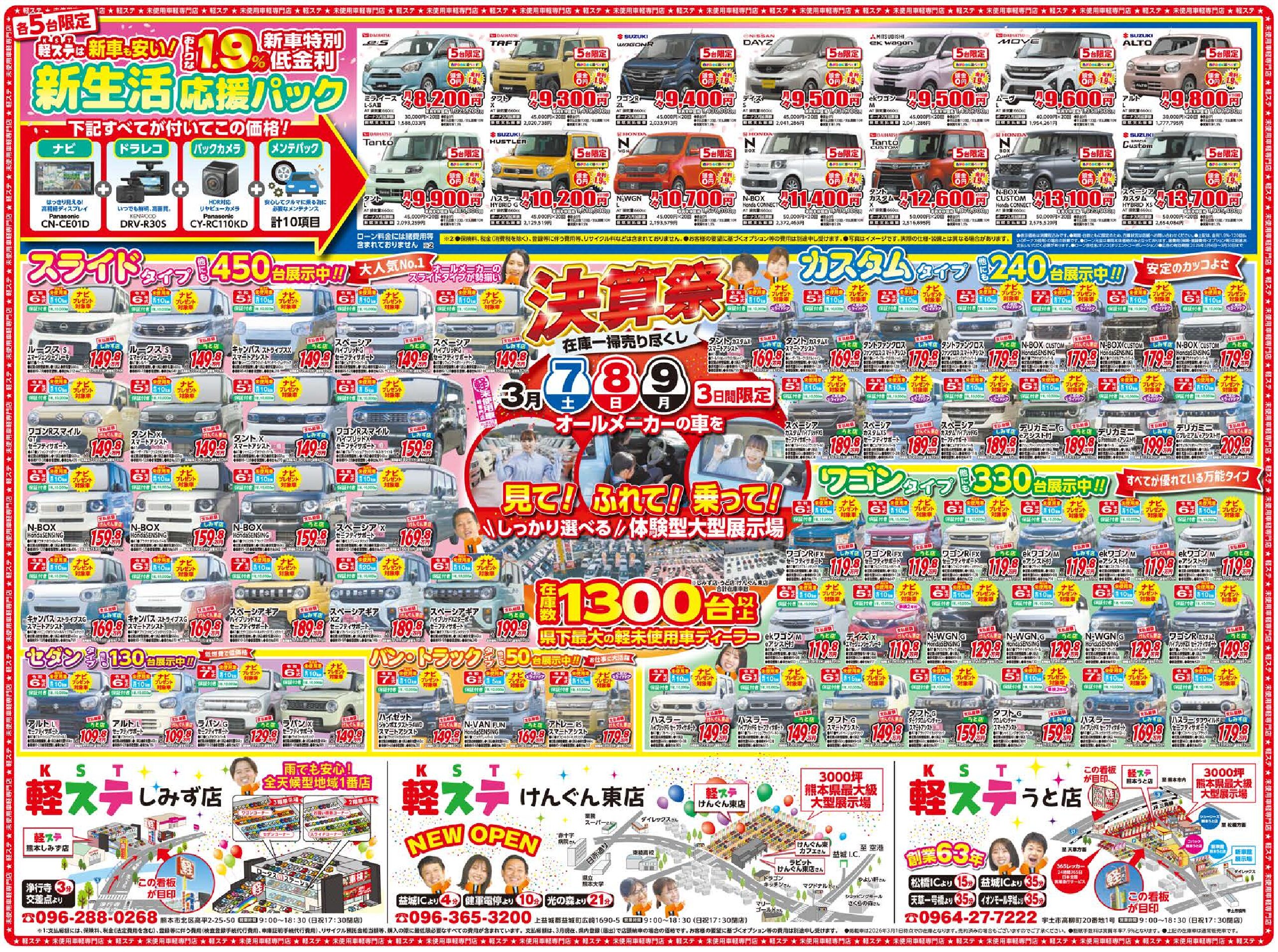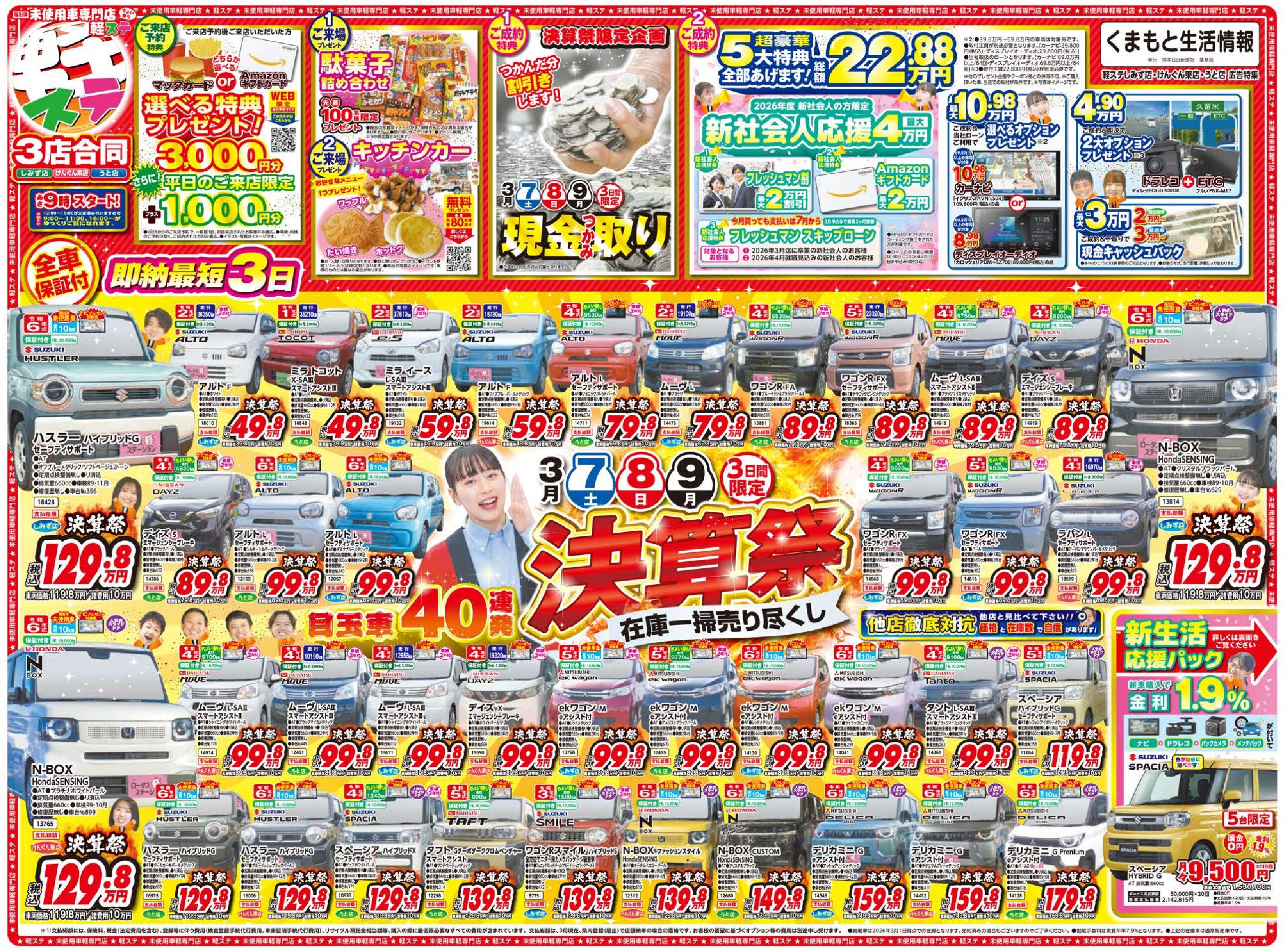 この度、軽ステ(けんぐん東店・熊本うと店・熊本しみず店)の3店舗合同にて、2026年3月「決算祭」フェアを開催いたします!年度末は決算期ならではの「大特価」「豪華特典」が満載!