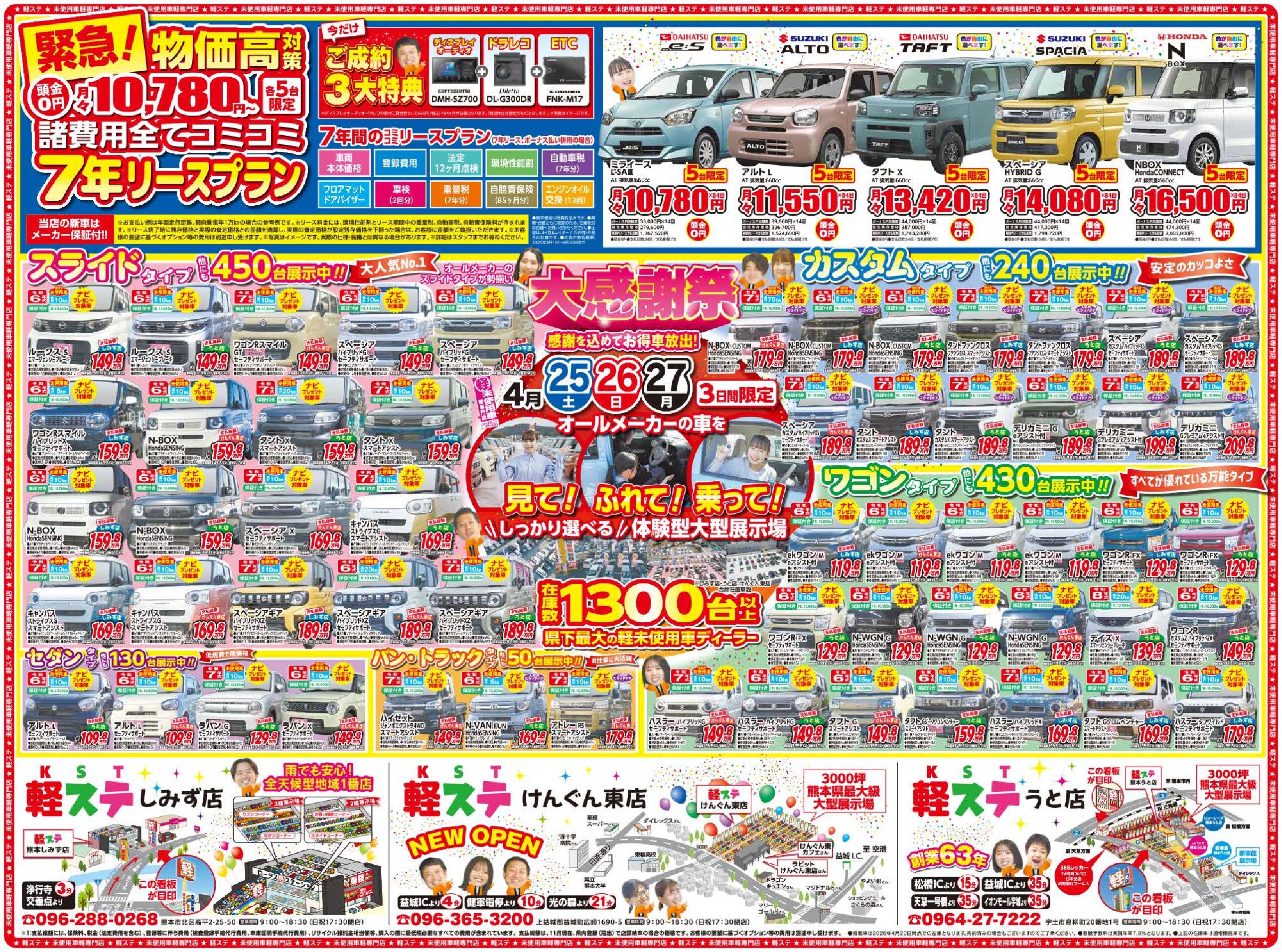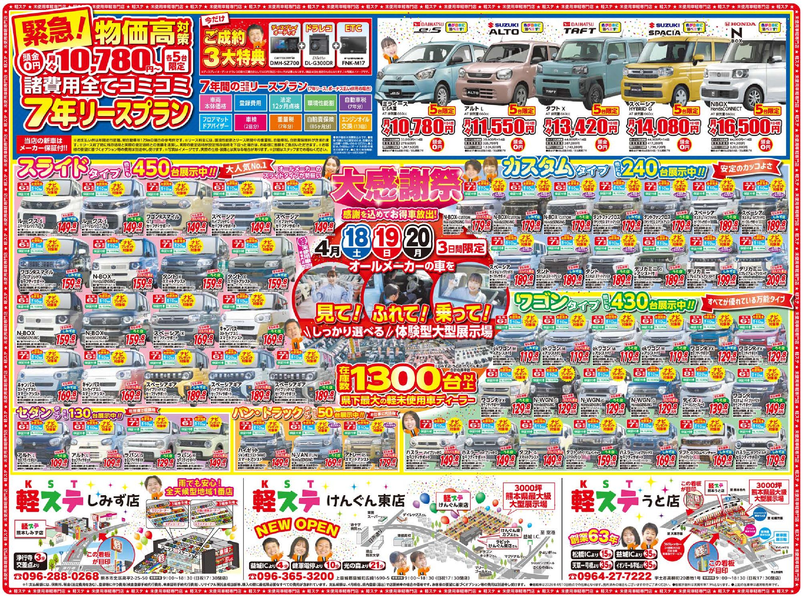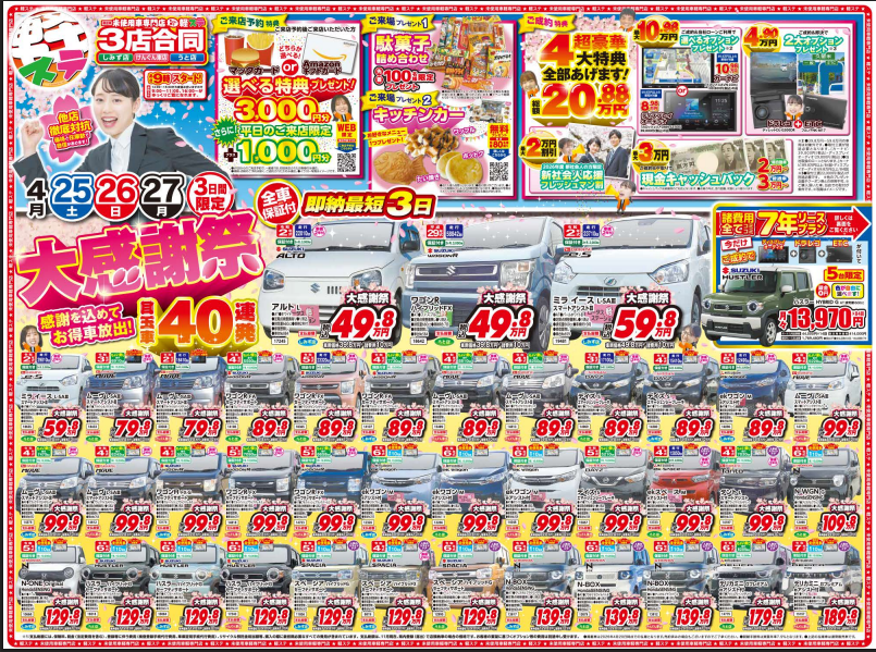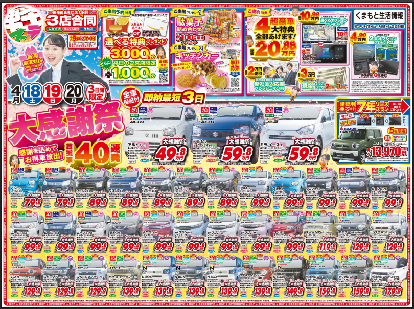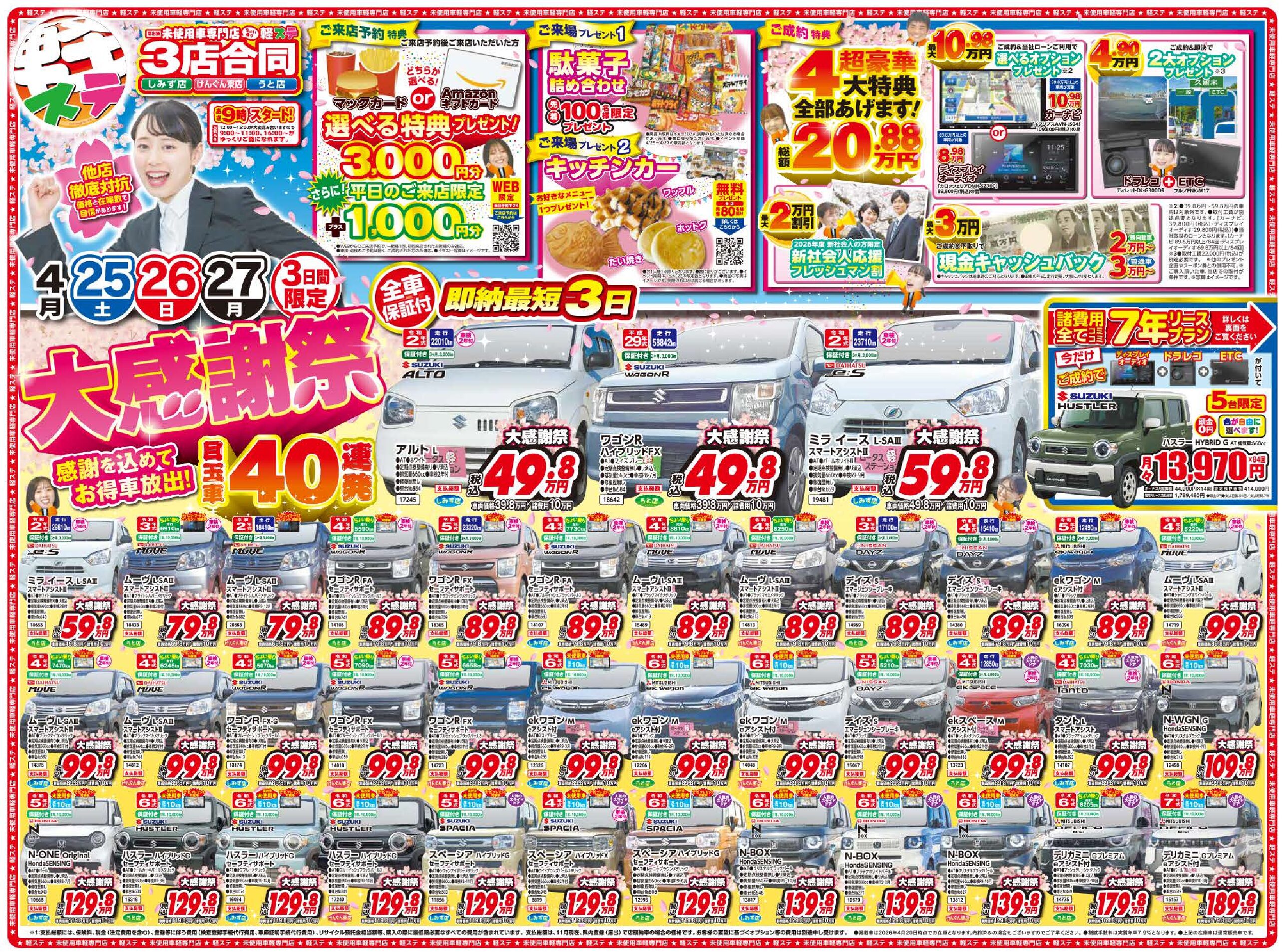 **4月18日(土)~4月20日(月)の3日間、軽ステ3店合同「大感謝祭」**を開催いたします!